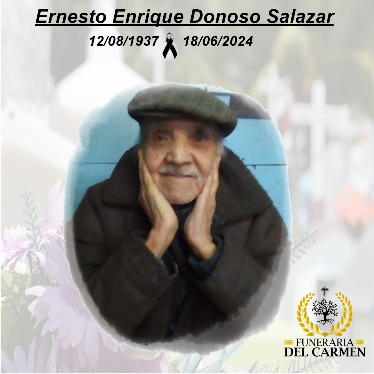Lamentamos informar el sensible fallecimiento de Don Ernesto Donoso, como equipo de Funeraria Del Carmen enviamos nuestras más sinceras condolencias a toda su familia, amigos y seres queridos.