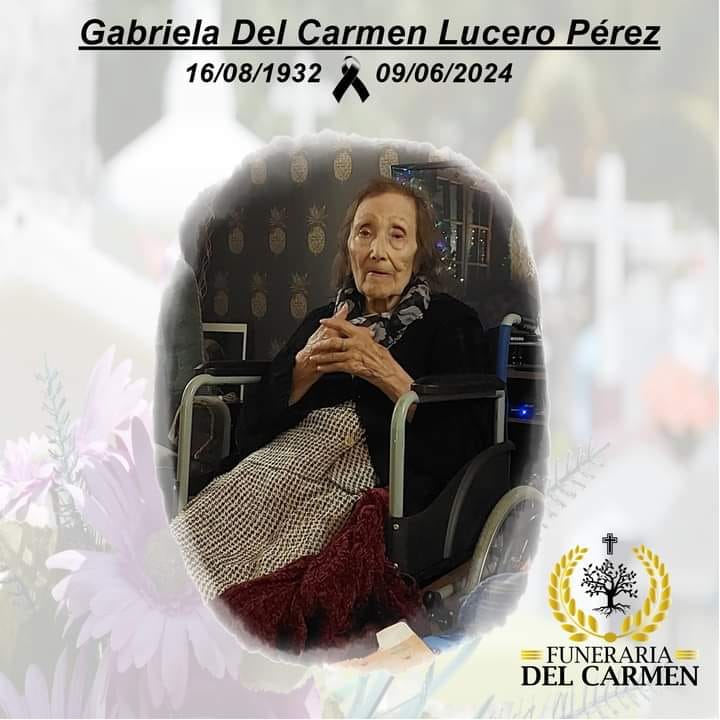 Lamentamos informar el sensible fallecimiento de la señora Gabriela Lucero Pérez. como equipo de Funeraria Del Carmen enviamos nuestras más sinceras condolencias a su Esposo, Hijos, nietos, familiares y amigos.