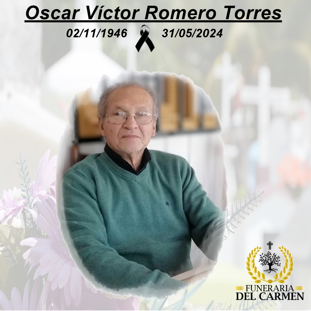 Lamentamos informar el sensible fallecimiento de Don Oscar Romero, como equipo de Funeraria Del Carmen enviamos nuestras más sinceras condolencias a toda su familia, amigos y seres queridos.