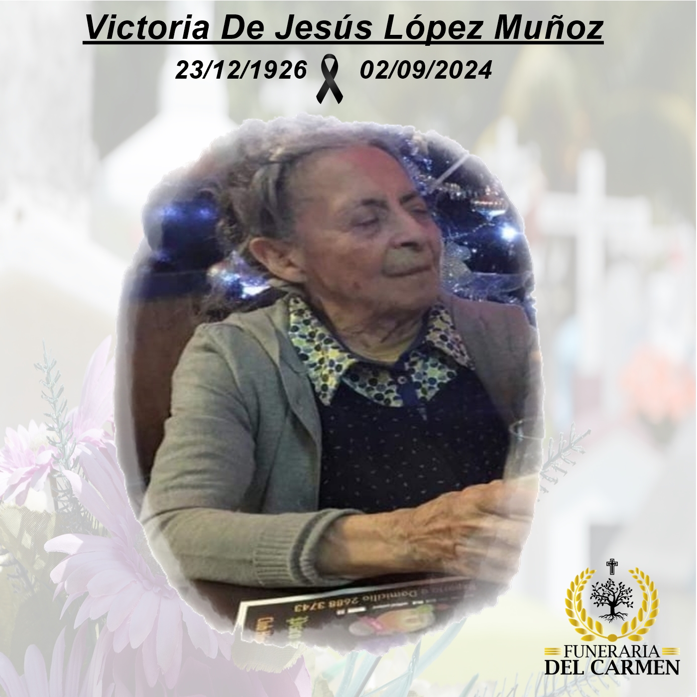 Lamentamos informar el sensible Fallecimiento de la Señora Victoria López, como equipo de Funeraria Del Carmen enviamos nuestras más sinceras condolencias a toda su familia, amigos y seres queridos.